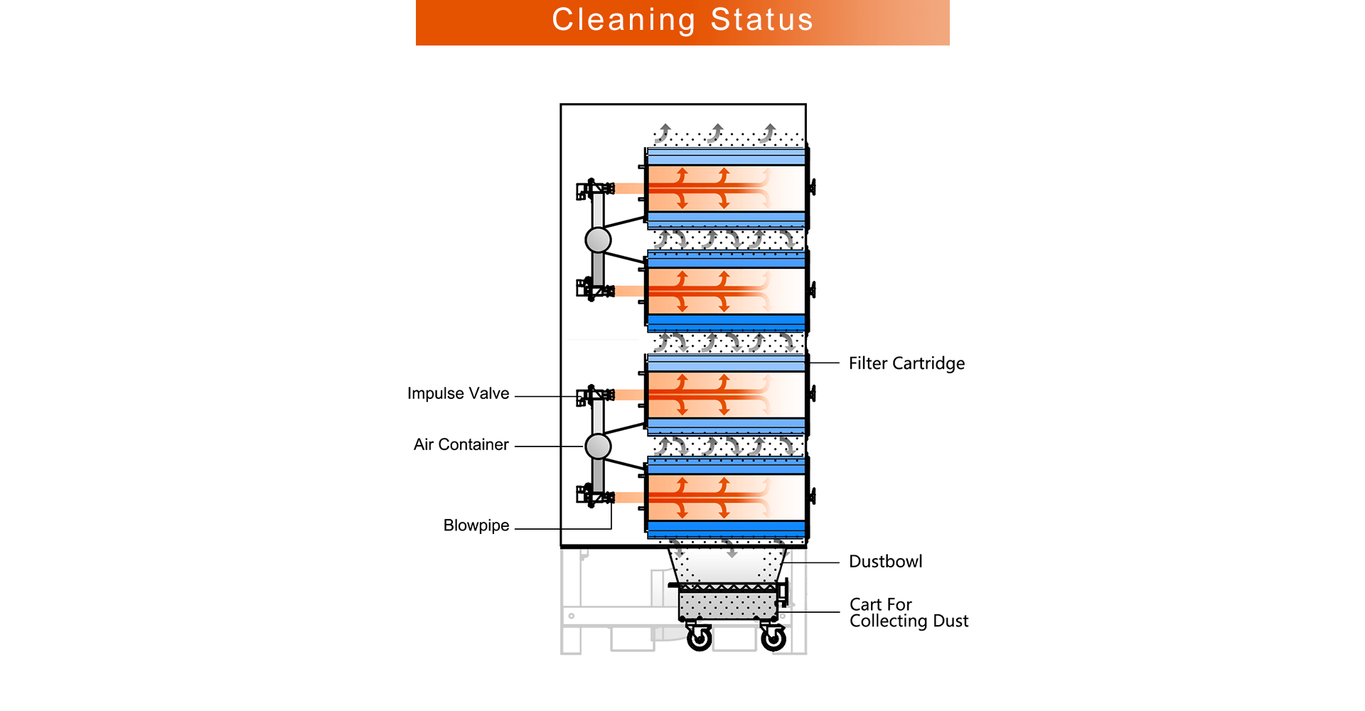 Through repeated impact vibrations with small amplitude, the dust accumulat- ed on the outside of the filter cartridge is shaken into the ash hopper.