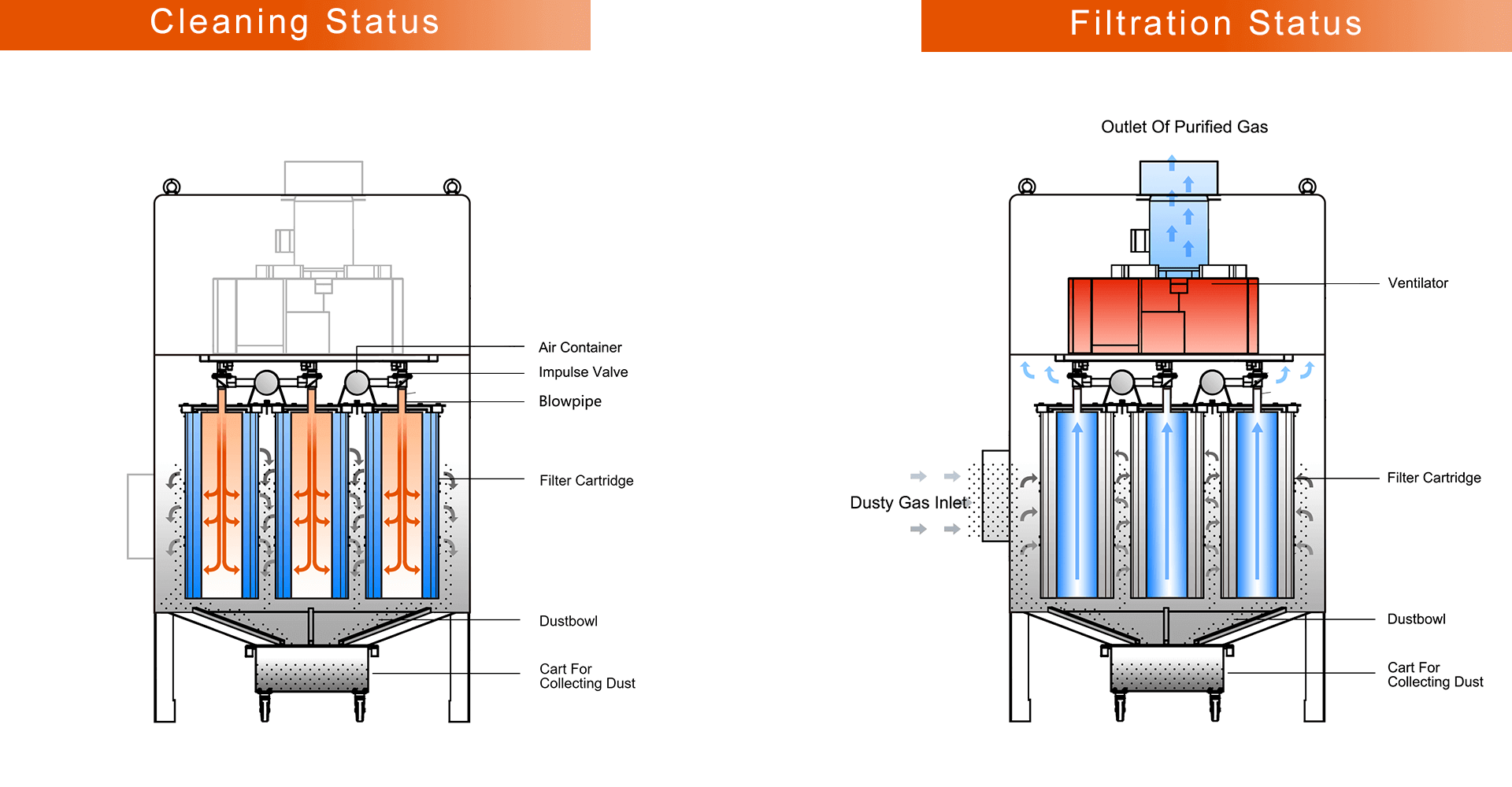 Through repeated impact vibrations with small amplitude, the dust accumulat- ed on the outside of the filter cartridge is shaken into the ash hopper.