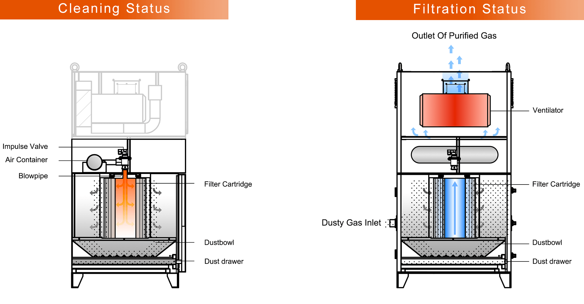 Through repeated impact vibrations with small amplitude, the dust accumulat- ed on the outside of the filter cartridge is shaken into the ash hopper.